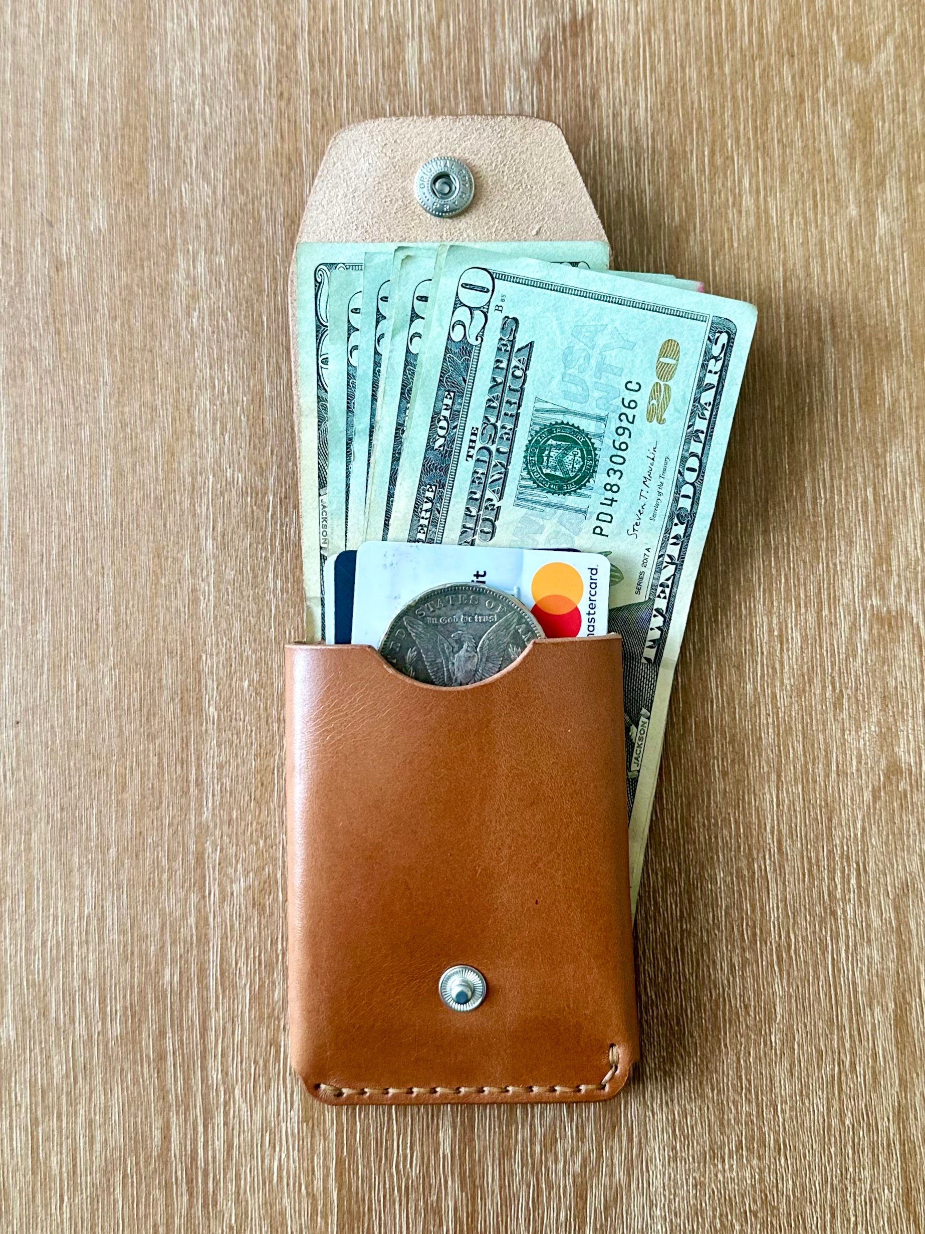 When I started designing this wallet I wanted something compact enough for your front pocket but also be able to hold all the essentials (yes my lucky silver dollar is essential). I wanted to use the best materials I could find to make something not only beautiful but that would last for years to come. I chose some of the best Italian leather I could find. I saddle stitch them by hand with Ritza Tiger, a super strong waxed thread. I chose brass Prym snaps for their excellent reputation for durability. The Cash Collector can hold 6+ cards in the front pocket and a couple more in the quick access slot on the back. 10 bills fit with no problem in the cash pocket. Make it your own by choosing your snap and thread color. Made by hand in Pearland, Texas USA.