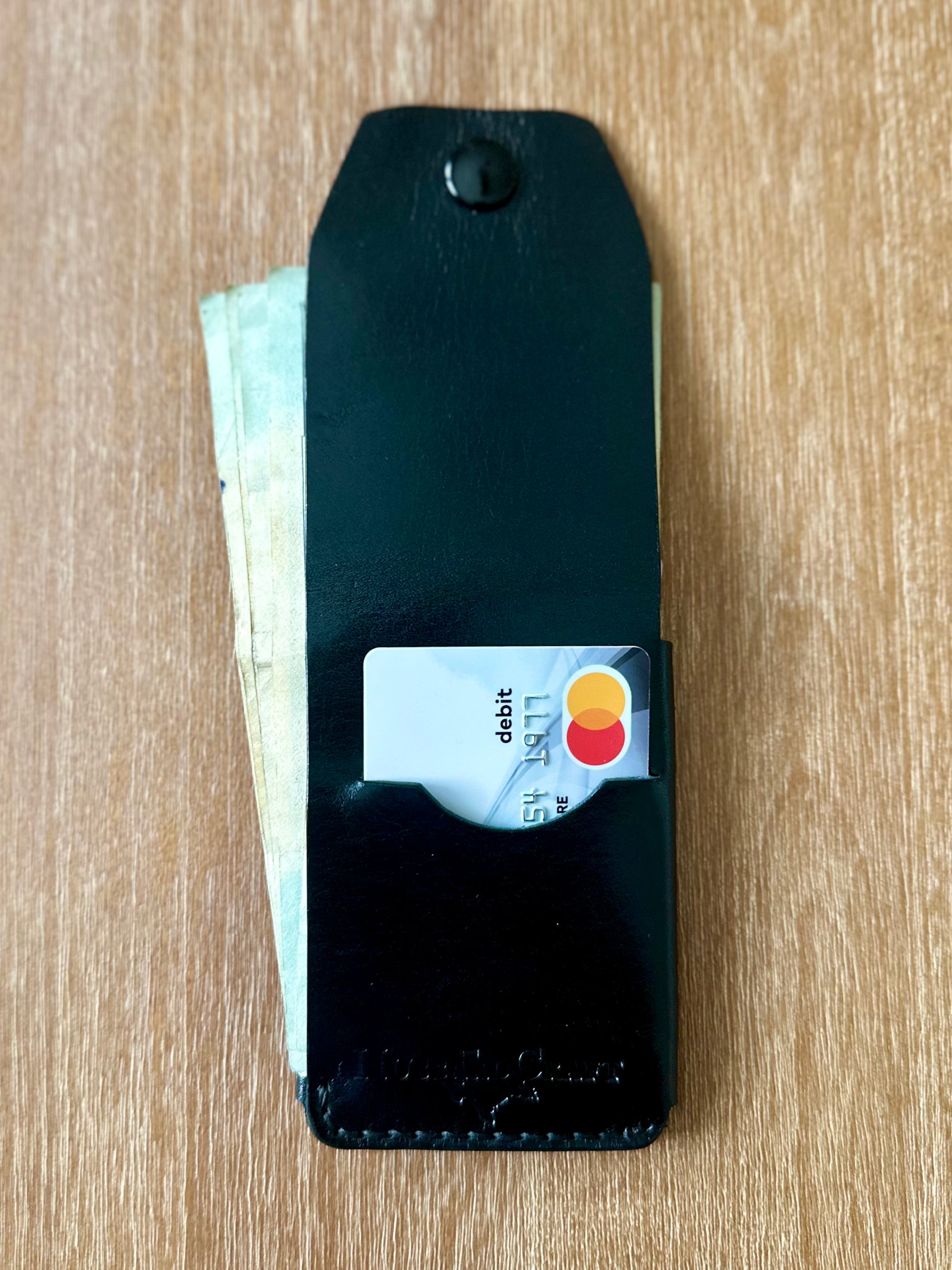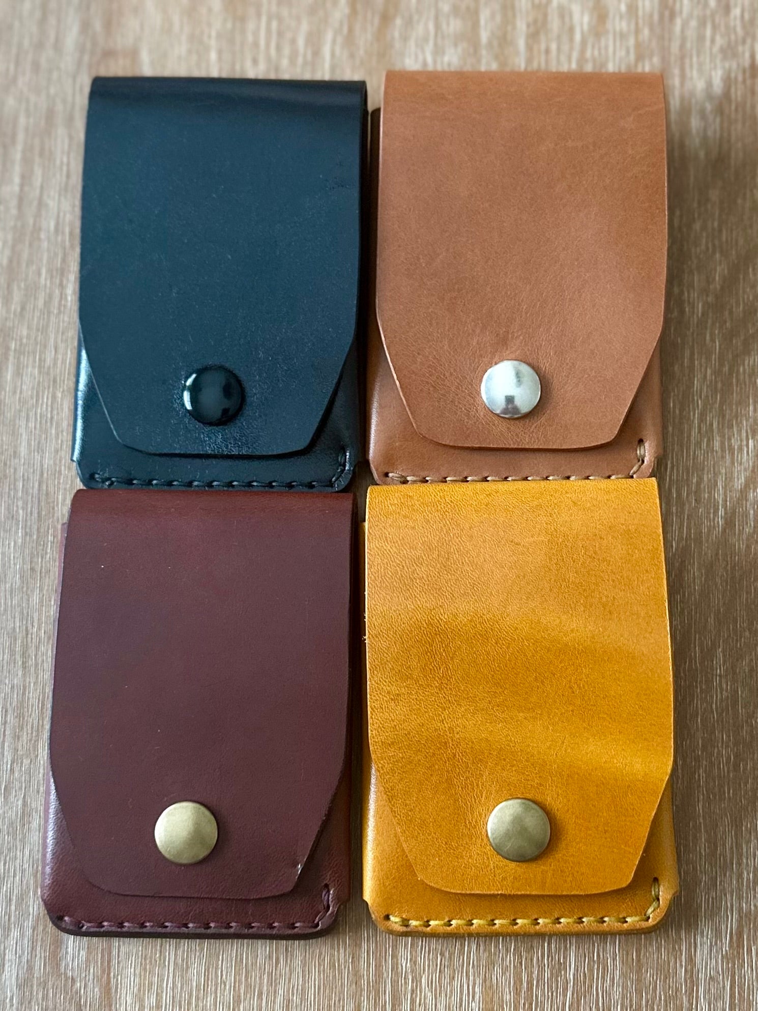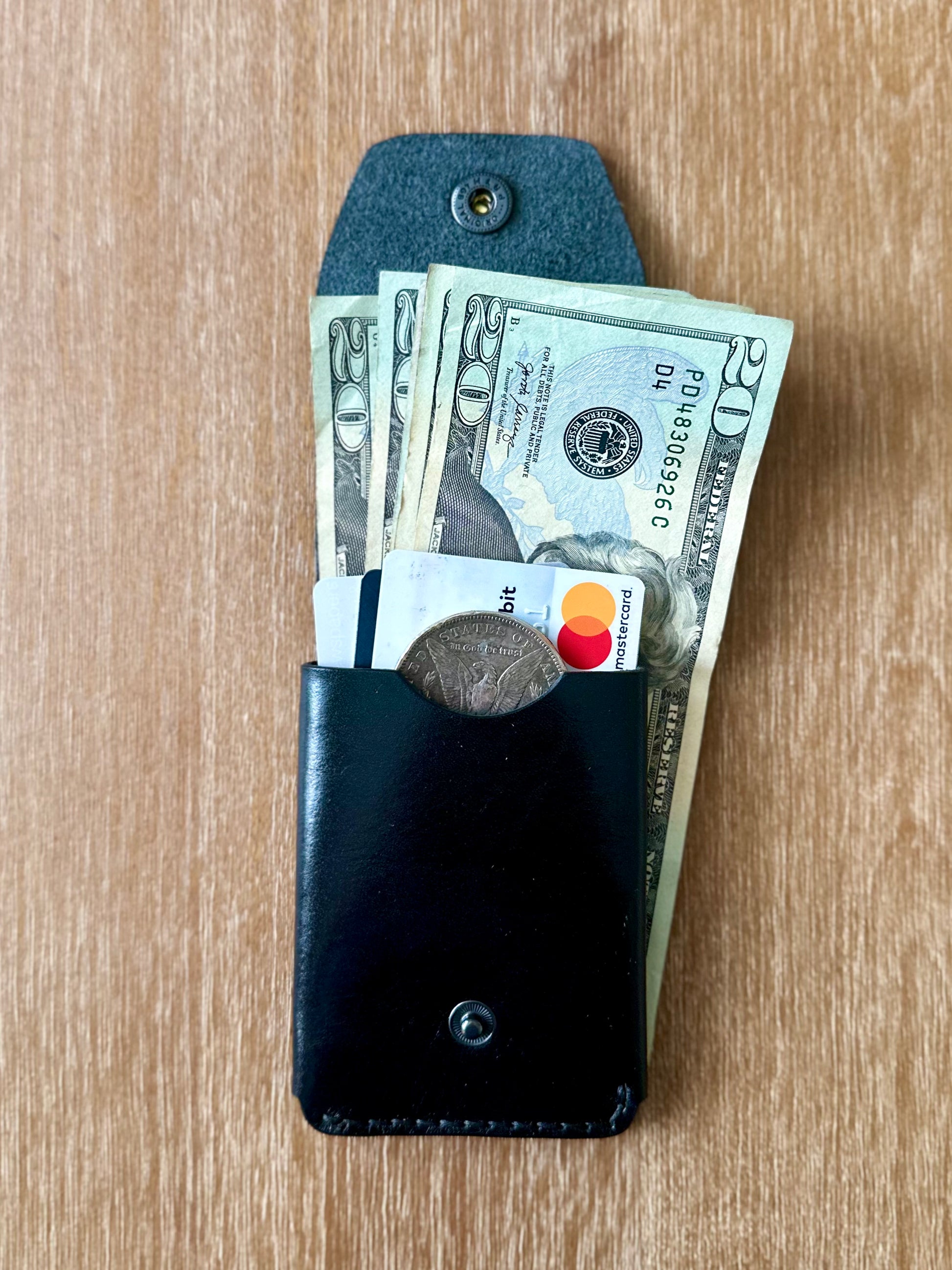 When I started designing this wallet I wanted something compact enough for your front pocket but also be able to hold all the essentials (yes my lucky silver dollar is essential). I wanted to use the best materials I could find to make something not only beautiful but that would last for years to come. I chose some of the best Italian leather I could find. I saddle stitch them by hand with Ritza Tiger, a super strong waxed thread. I chose brass Prym snaps for their excellent reputation for durability. The Cash Collector can hold 6+ cards in the front pocket and a couple more in the quick access slot on the back. 10 bills fit with no problem in the cash pocket. Make it your own by choosing your snap and thread color. Made by hand in Pearland, Texas USA.
