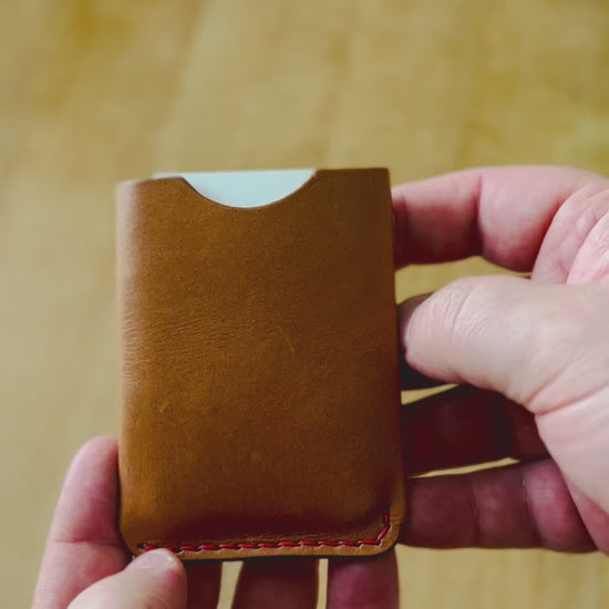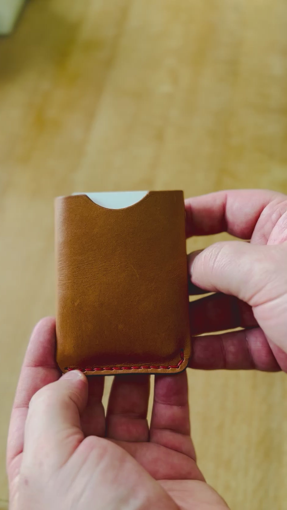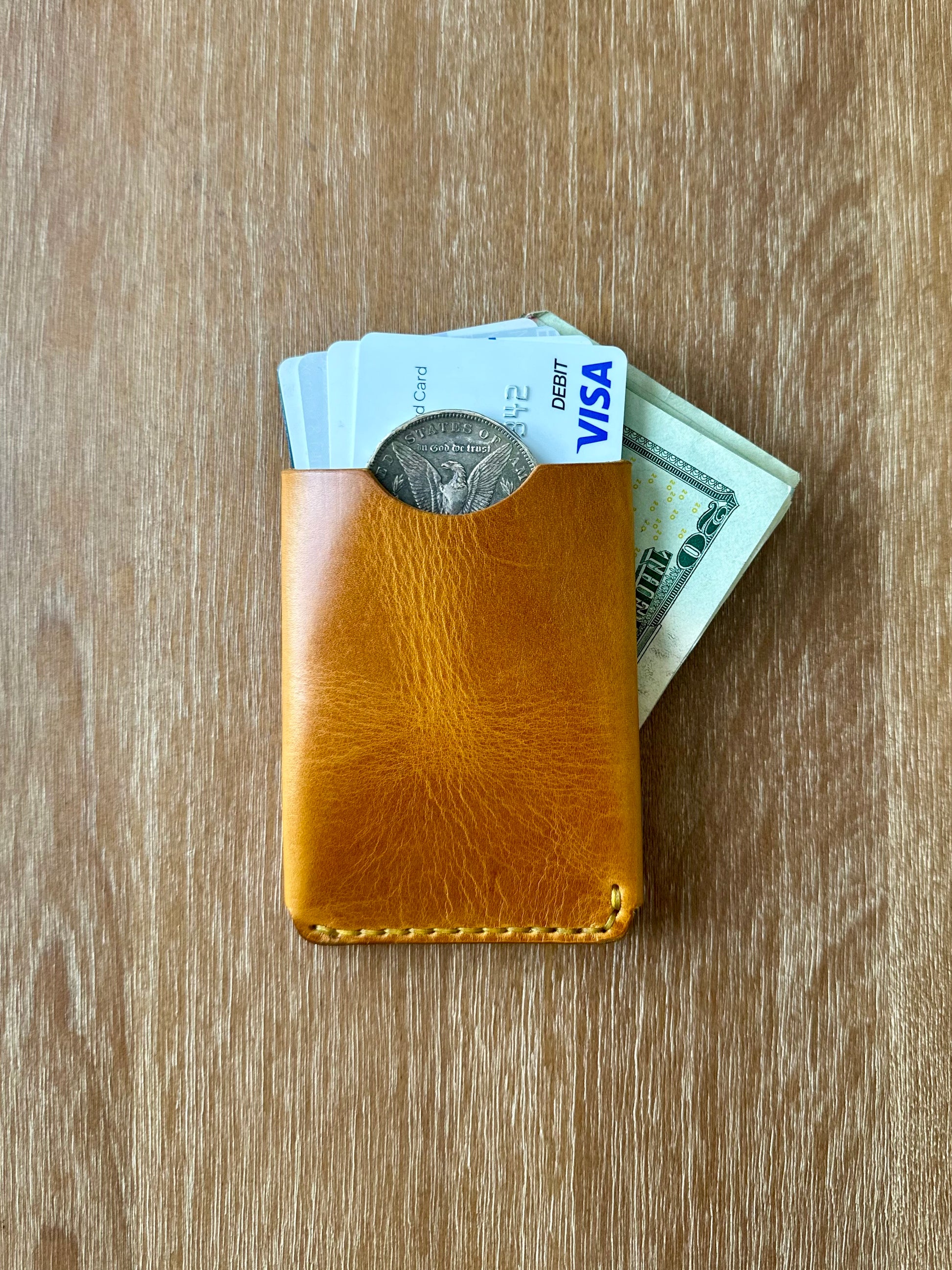 When I started designing this wallet I wanted something compact enough for your front pocket but also be able to hold all the essentials (yes my lucky silver dollar is essential). I wanted to use the best materials I could find to make something not only beautiful but that would last for years to come. I chose some of the best Italian leather I could find. I saddle stitch them by hand with Ritza Tiger, a super strong waxed thread.  The Topless Cash Collector can hold 6+ cards in the card slot. 6 bills folded in half fit with no problem in the cash pocket. Make it your own by choosing your thread color. Hand made in Pearland, Tx, USA.